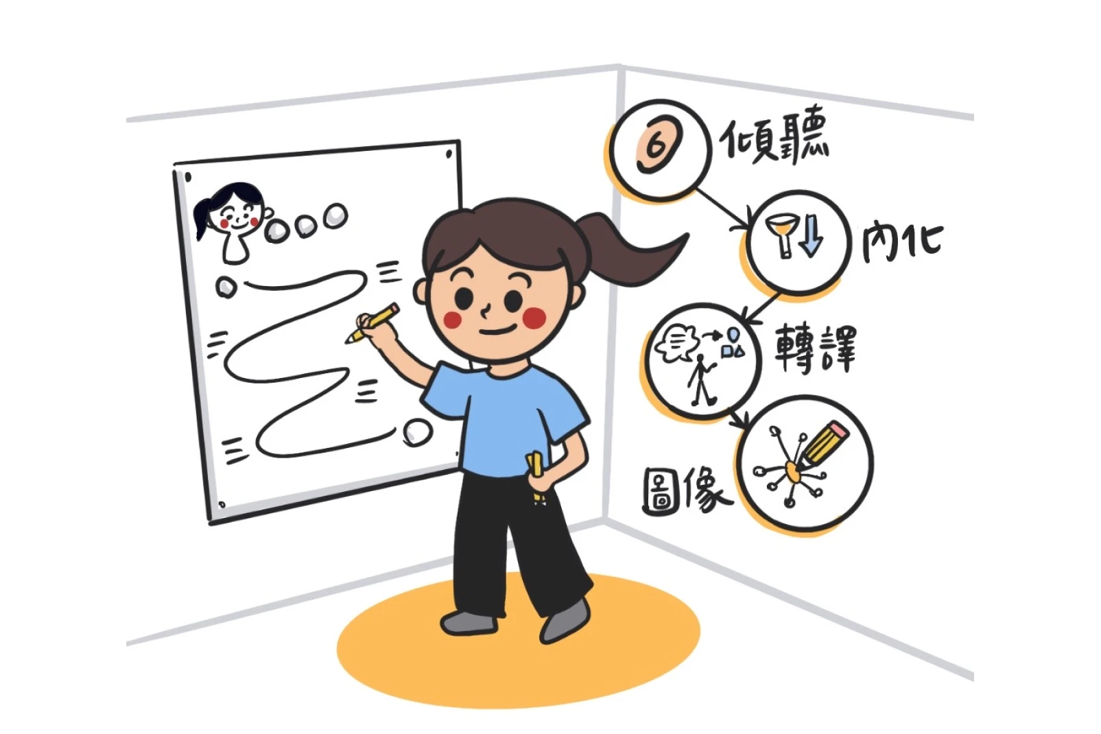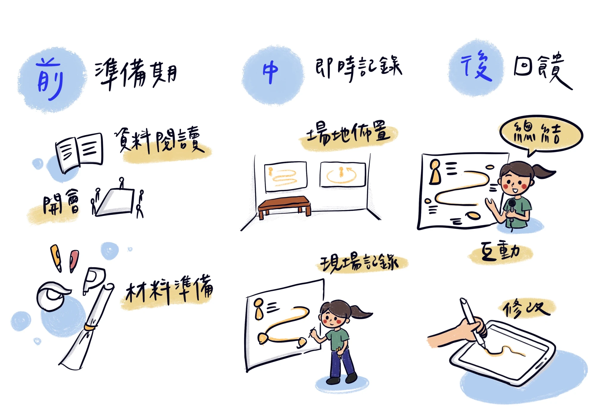 視覺筆記可以幫助你理解、判讀資訊,也能在紀錄的同時完成整理。更棒的是,圖像化筆記不但對於吸收知識有幫助,如果日後需要將內容向外傳遞,也是非常便於整理溝通的素材。